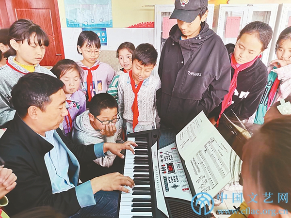 中央音乐学院驻村干部李玮在给二塘乡中心学校小学生们上音乐课